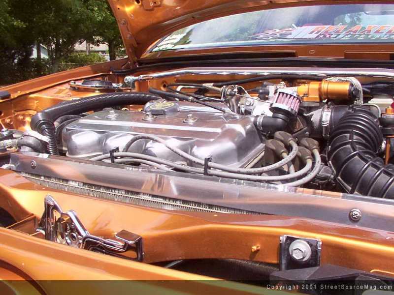 Since Tommy had the firewall and inner fenders painted to match the car, it was time to dress up the engine a little to finish the engine bay. The valve cover was polished as well as a few other aluminum brackets while several other brackets were chromed dipped. Some steal braid and wire loom also dress up the engine. To round things out in the rear, there is a polished DC Sports muffler.