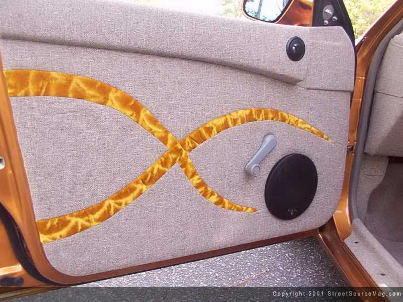 Now that the exterior and engine of Tommy's Escort are as smooth as possible, it was time to build an interior that would round out the total package. After showing for a couple years with the factory interior with some gray tweed pieces, it was time to change the look all together. All of the factory panels were pulled out and stripped so the new interior color could be added, this time Tommy chose to go with tan. Every thing from the headliner to the dash was wrapped using tan tweed.