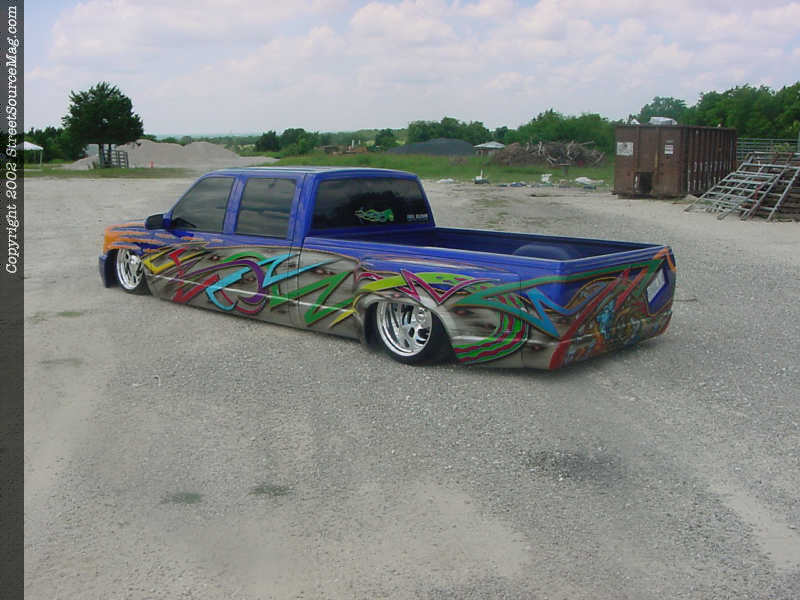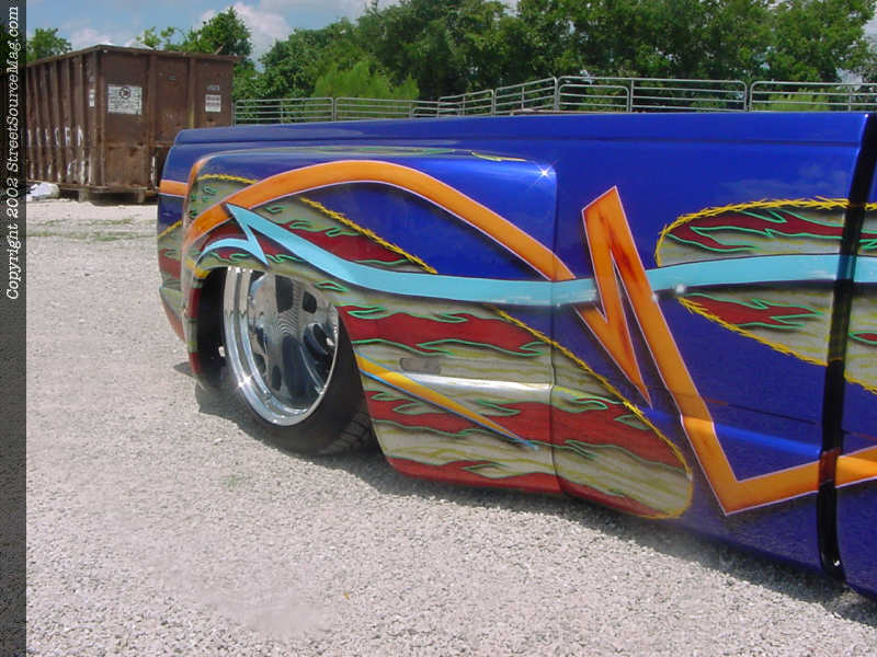 Beginning with the suspension Jason new he wanted to go low, real low. In order to get the truck down where Jason wanted it he junked all the factory suspension. Replacing the front suspension is a set of upper and lower tubular control arms; 2" drop spindles and a set of 2600lbs firestone airbags in place of the factory coils. Out back Jason replaced the leaf springs with a 2-link and a matching set of airbags. While bolting up the 2-link in the rear Jason made sure to notch the frame high enough to let the frame set on the ground.