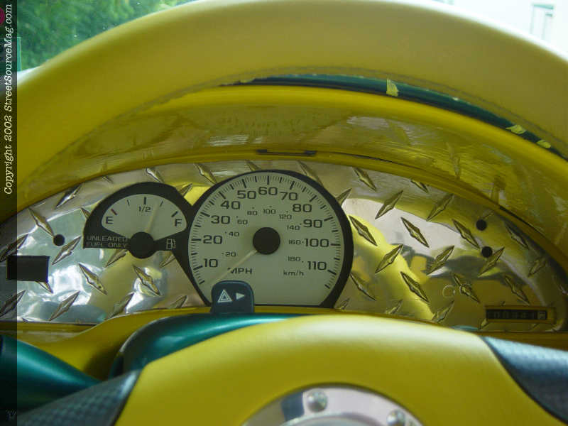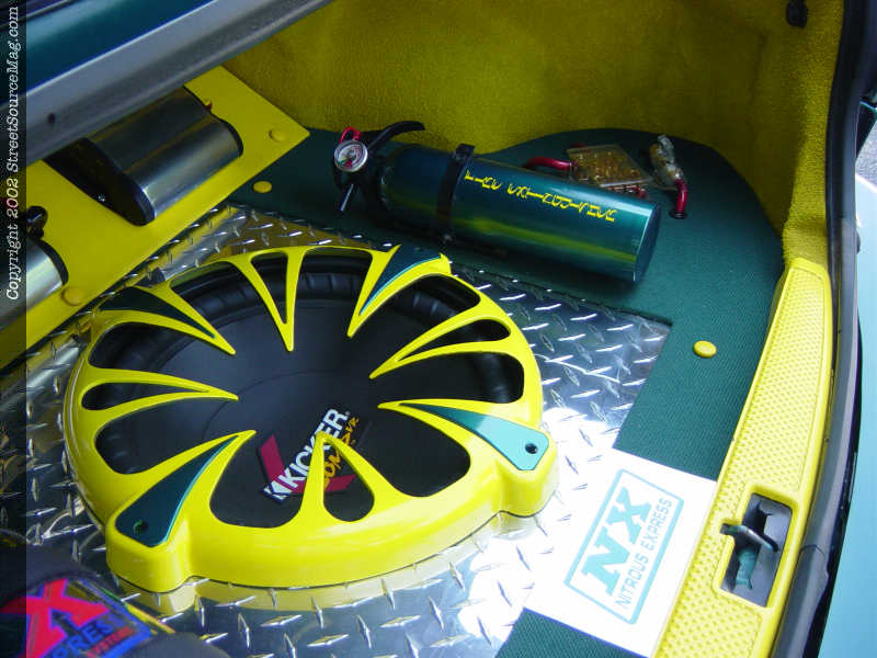 For entertainment to and from shows, Chris has personally installed a full audio/video setup. The system starts out with an Alpine head unit and a Clarion Pro Audio EQ and Bass Kick. From there the signal is fed to a pair of Coustic amps then off to his Memphis mids and tweets and his Kicker VR 15, which is mounted in the spare tire well. To round off his system there is a Sony PS2 mounted where the factory glove box was and a LCD monitor in both of the sun visors.