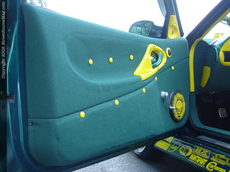 Several of the interior trim panels have also been fiber glassed and painted yellow while the remaining panels have been wrapped in green tweed. The seats are a combination of green and yellow leather from Katzkin. The factory front seat belts have been removed in favor of a set of Weapon R racing belts. To control this one of a kind Cavi, Chris chose a yellow leather Isota steering wheel for its look and feel.