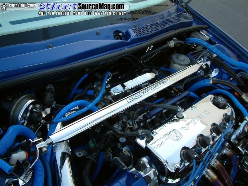 With the horsepower being added, the first item at hand would be installing a set of Honda Prelude axles to help handle the extra horse. Next, a Hayame camshaft would be installed along with porting and polishing the head. An AEM cold air intake, DC Sport 4 to 1 header and polished 2 ½ inch Hayame cat-back exhaust would all be installed.  NGK wires along with a 120 amp alternator would be installed to help provide current. Not yet complete, Shunyaa would have many engine items chrome plated along with installing blue engine loom over bare wires to finish off his over all show winning ride. Shunyaa would like to thank his club Unfadeable Styles, mom, his Ex (Ha-Ha), Street Designs, Sal And everyone over at Nu-Image for all there love and support.
