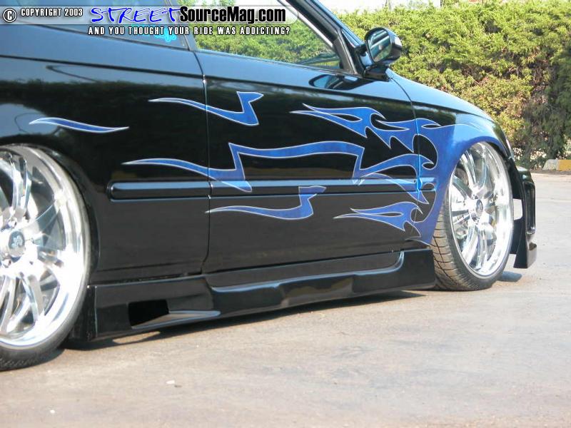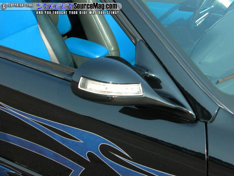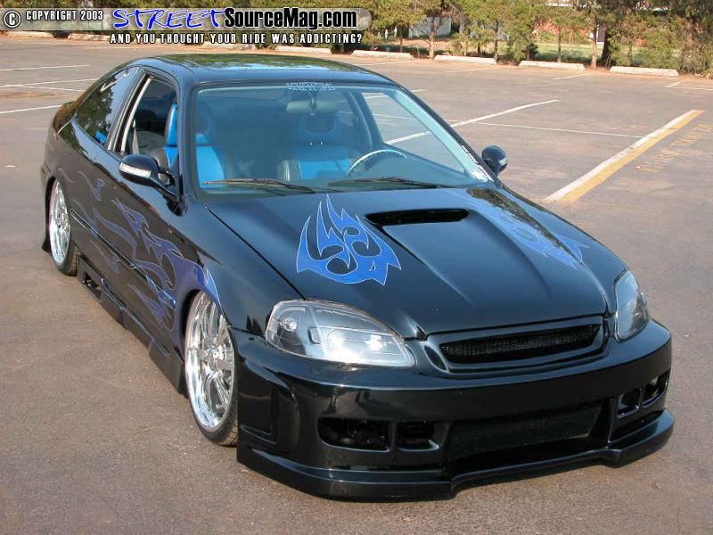 Gotta get rid of any dimples, so she also shaved them all - well, the door handles, antenna, wing, and emblems that is to create a much smoother and cleaner look. To complete this $25, 000 dollar look the crew at Custom Concepts in Oklahoma City slathered the beauty in Black Flamingo Pearl and accented the Honda's new features with Blue Marble tribal graphics.