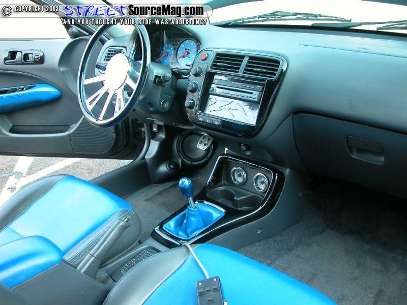 For some girls beauty is only skin deep, but Lindsay had no problem overcoming that shallow idea as she turned her attention to the interior of this vixen. With the help of Lopez Upholstery, Lindsay wrapped the door panels, the custom fabricated kick panels, and seats in charcoal and blue vinyl.   She also had all the existing accent pieces smoothed and painted, upgraded to the blue Indiglo gauges and opted for the B.A.D. Gunslinger steering wheel to enhance the rest of distinct body mods.