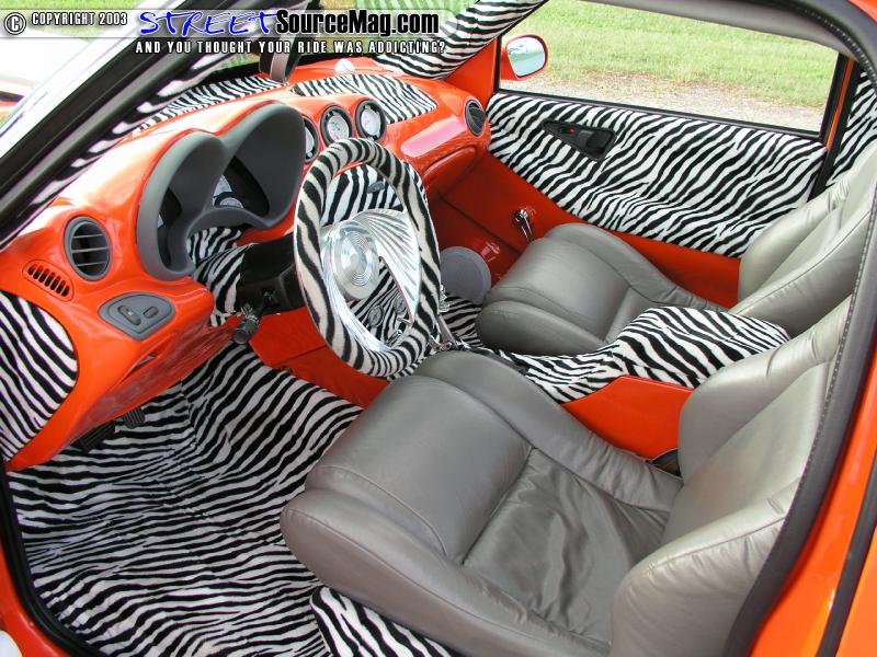 and other items were treated with more Zebra print then the local zoo could provide. Ok so no zebra's were actually killed to supply the material so we lied. For seating arrangements Dustin had a seat of Fiero buckets cut down and rewrapped in Grey Italian Leather. Ok so maybe it wasn't Italian leather but it looks good though.