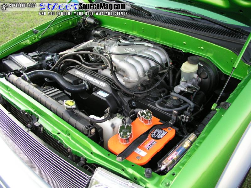 Next Kevin took a set of wire cutters and decided to relocate EVERYTHING under the hood that was in the way. Kevin then added a set of gas shocks to hold the hood up instead of the prop rod design that came with the Taco. All of this to allow the engine compartment to host a clean look.