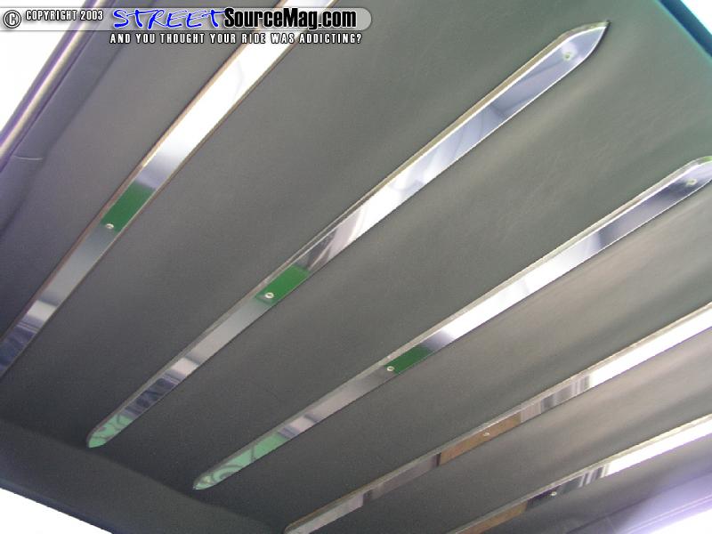 A custom center console was then built to house the air ride control items of the taco. A custom built enclosure was fiberglassed to house Kicker Comp 10's and a Kicker 700.5 amp. A Pioneer AVX-P 7300 was the headunit of choice along with an indash DVD player.   The headliner was then wrapped in gray leather and custom one off Billet accents were custom made to adorn the headliner. To finish off the interior a Colorado Customs Whiskey steering wheel was added to match the wheels that were on the truck.