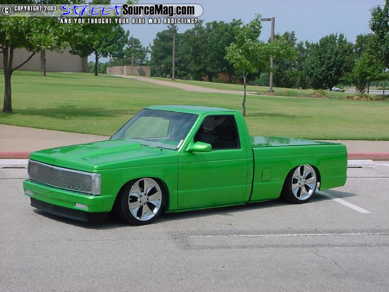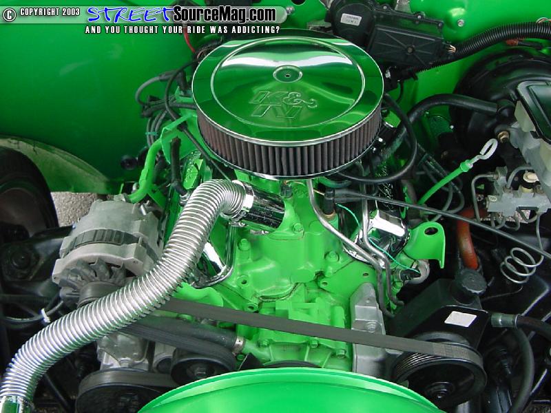 In the bed you will find that Daniel didn't cut any corners, he went all by spraying a green bed liner and added diamond plate accents matching his diamond plate bottle rack.   For the engine compartment Daniel pulled the engine and painted everything possible to match the exterior, what wasn't painted was dipped in shiny ass chrome, for the bling bling affect. Along with the paint and chrome Daniel added Cool-flex hoses and a chrome air cleaner cover.