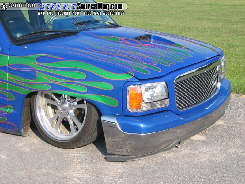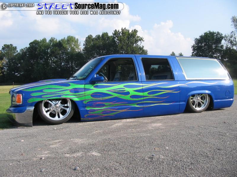 Keeping up with the Cadillac appeal Jake customized the rear of his SUV to incase 97 Cadillac Deville lights, and slapped on a Sir Michaels roll pan. To give it the cleanest look he could Jake had his door handles shaved and suicided the rear doors. Moving right along the truck was almost ready for paint. Mike Contreras would take Jakes ideas and paint the exterior of the SUV Audi Nagaro blue with House of Kolor Lime Gold Candy flames. The flames where stripped with red and orange to give them an accent that would stand out against the blue base.