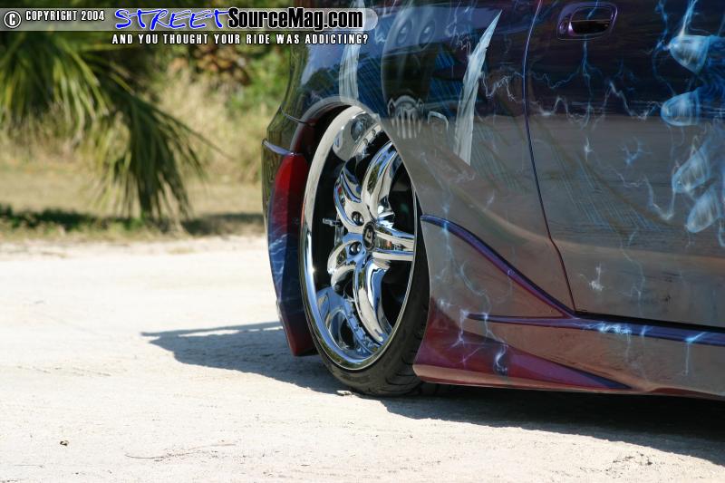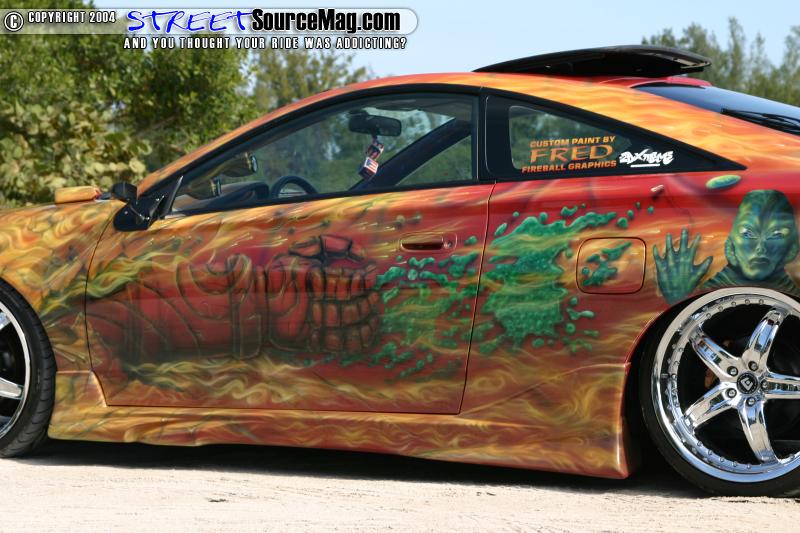 With the clean look he wanted accomplished Jose called up Fred Shutrump of www.fireballgraphicsbyfred.com to come up with a graphic design for his Celica. Because Fred was into painting cartoon/comic style graphics he sprayed Jose’s Celica with Hell boy graphics, flames, and slim.