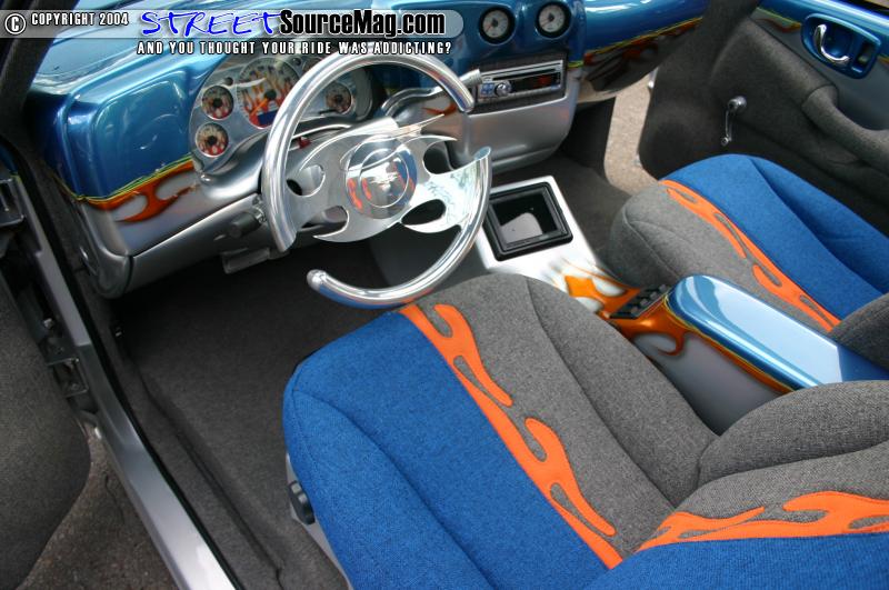 The headliner was wrapped in tweed and the seats were wrapped in blue tweed and grey and orange graphics to match the exterior paint job by Strader’s Upholstery of Milford, DE. Joe’s Car Stereo wired up the Alpine CD player, MS Quart interior speakers, and Kicker Solo baric subs.