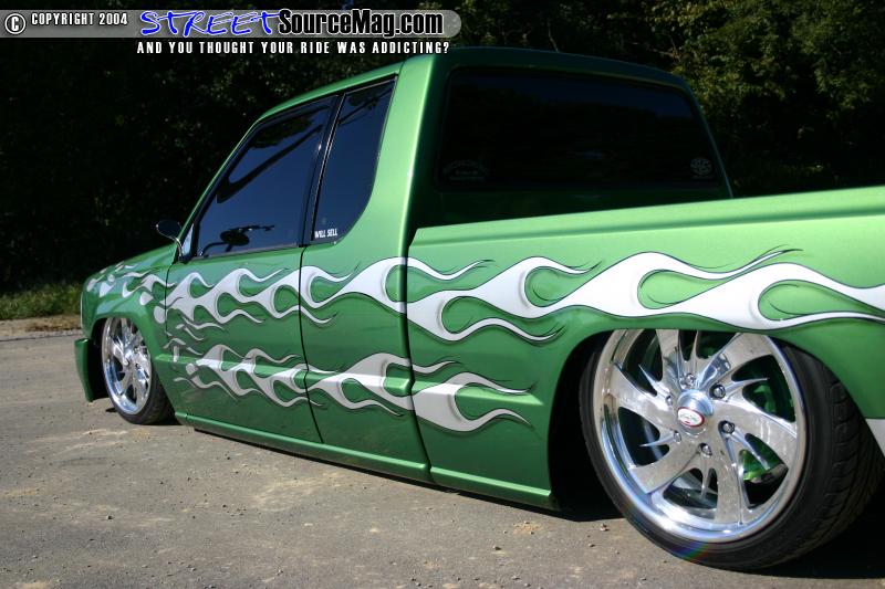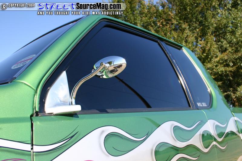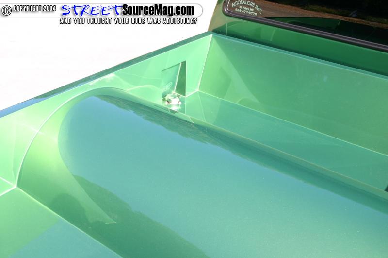 Clear corners sit on each side above the custom fit Toyota front bumper. The hood was modified with a Eclipse bubble molded onto it. A custom set of mirrors was also bolted up to complete the look. Joe Benne then laid down the Dupont green base and topped it off with a set of silver flames outlined in purple.