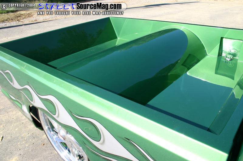 The exterior of Chico’s truck features shaved door handles, gas door, taillights, and a molded rear bumper. Inside the bed it was flushed in with metal, and a bridge cover, the gas door was even relocated into the bed of the truck. Up front the stock grille was swapped out for a chrome one and a billet insert was fitted in.