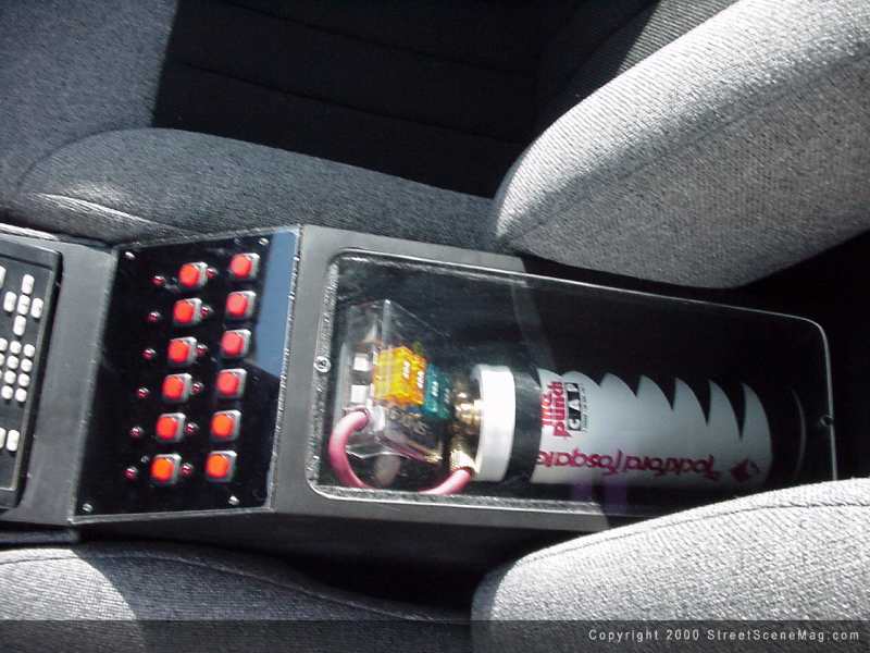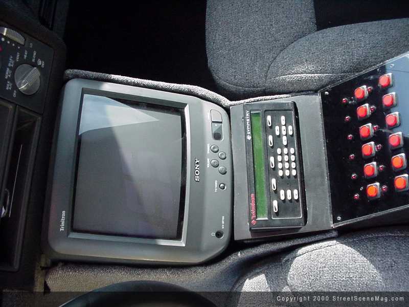 Using Formica as a coating along with a Plexiglas face to cover the amps the box was coming together nicely. He then went to the console, which enclosed all of the relays and feet of wire. This is the location were he would place the switches, fuse block and capacitor. The next step would be to install the T.V. and VCR into the custom console. Scott had the Alpine CDM 7835 CD player installed and molded into the headliner. Now to bring out the sound, 6 ½ Mids and 4x6 plates were installed for the highs, and 10” OZ’s were installed to bring out the bass.