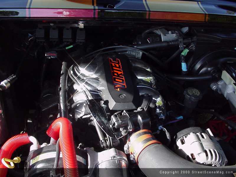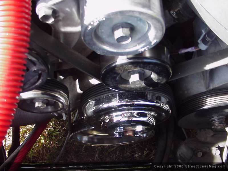 Scott decided that the rollers would be a set of 18x7 Billet Specialties wrapped in 225/35 zr18 rubber up front. In the rear, Scott’s decision was to go with a set of 20x10 Billet Specialties that were then wrapped in 285/30zr 20-inch rubber. To bring the engine compartment together, Scott added many shinny and power added goodies. To get things started, the installation of a Flexalite cooling fan was installed along with chrome engine pulleys.