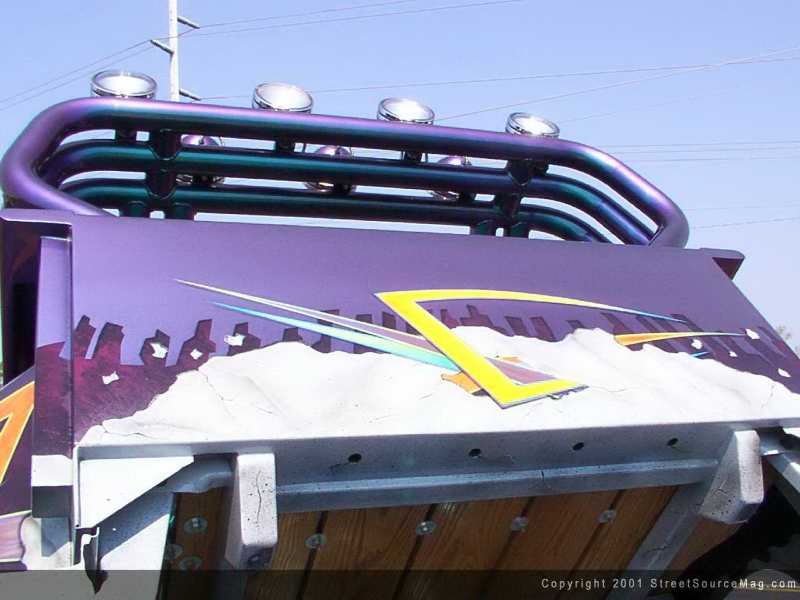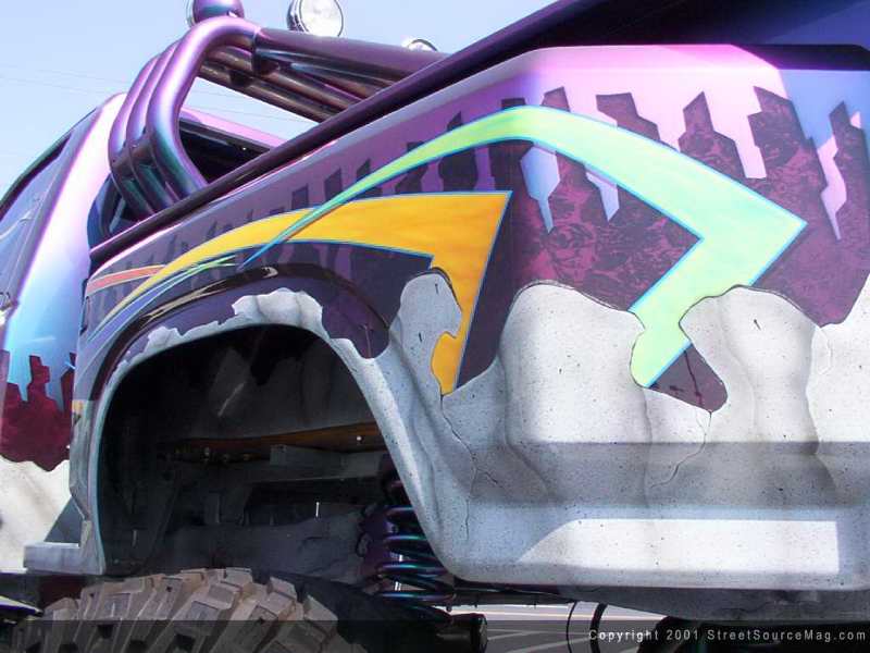 The gas filler door was shaved as well as the entire gas tank and filler tubing to make room for the aluminum 10-gallon tank to be mounted behind the cab between the frame rails. At the rear of the bed, the taillights were shaved as well as the rear bumper and a set of billet taillights were mounted under the tailgate which was also smoothed to match the front of the bed and the rear of the cab.  Now that Johnny was happy with the bodywork that was done to his 4x4, it was time to pick a color that would stand out on the truck. Since he couldn't decide on just one color, Dupont Chromalusion was chosen as the base color. This gave Johnny a few different color flips of its own, but he still wasn't happy with that. The bottom of the truck was sprayed with a gray base then airbrushed to give the illusion of cracked rock. Coming off the front of the truck is a set of orange and yellow flames that extend all the way to the middle of the doors.