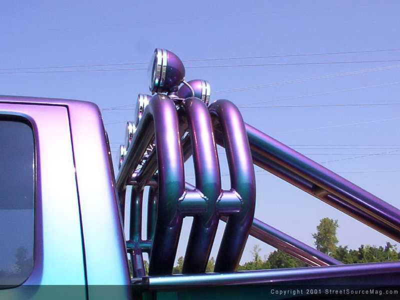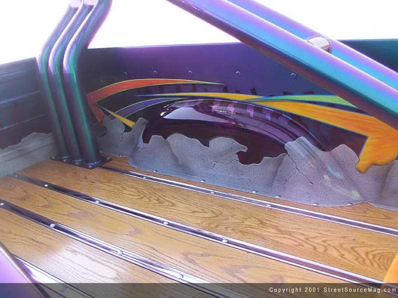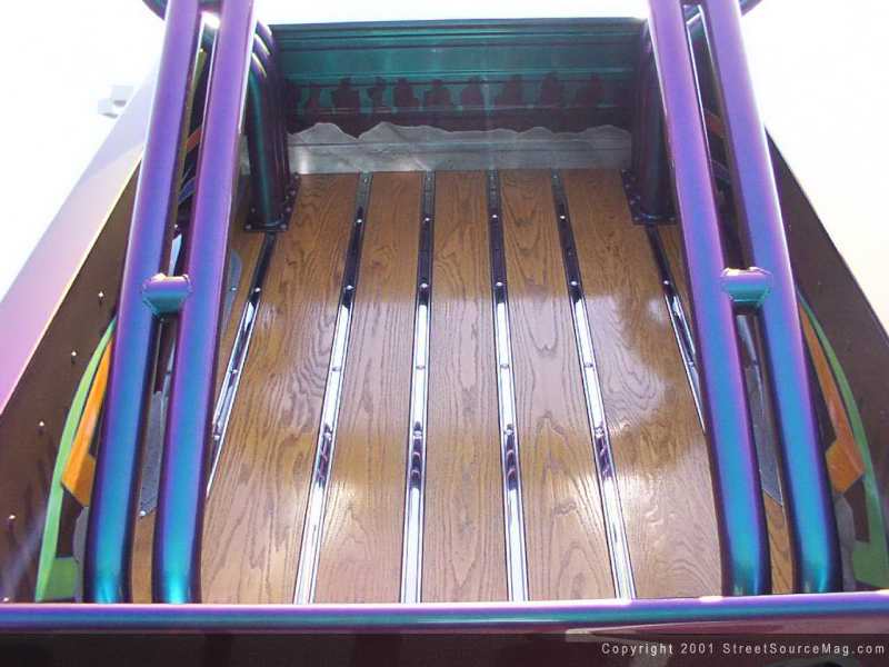 Now that we are inside the bed of this Ford, the floor has been swapped for a wood panel floor and stained to perfection and a 3" triple roll bar was bolted in and painted Chromalusion to match the body of the truck. Johnny did all of the work to complete the body of this truck with the help of his friend Mike Boyce.