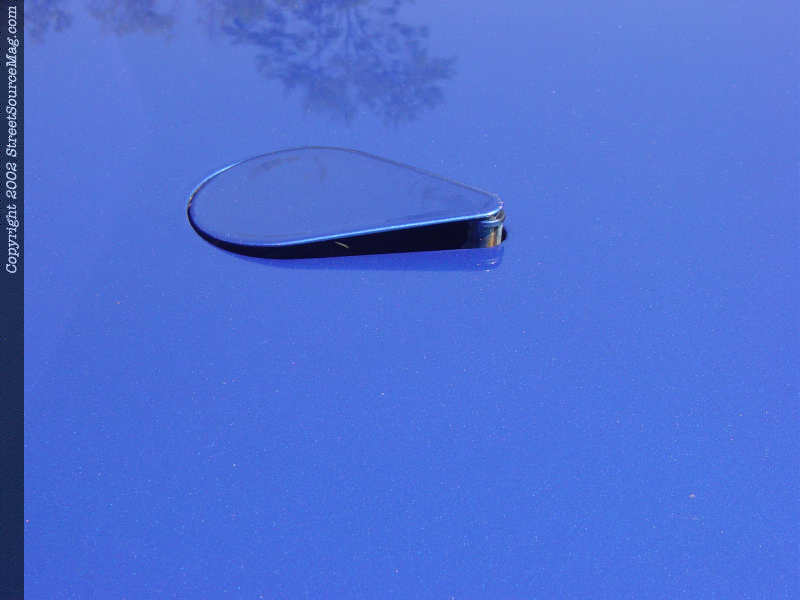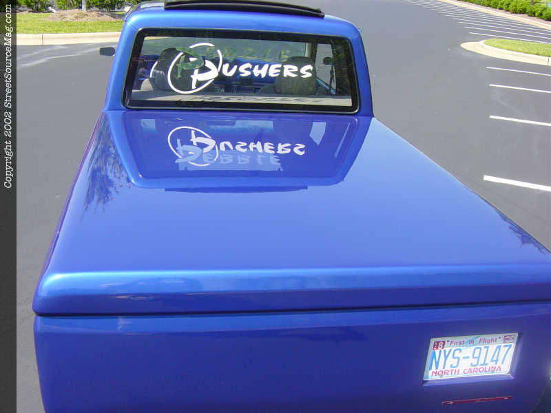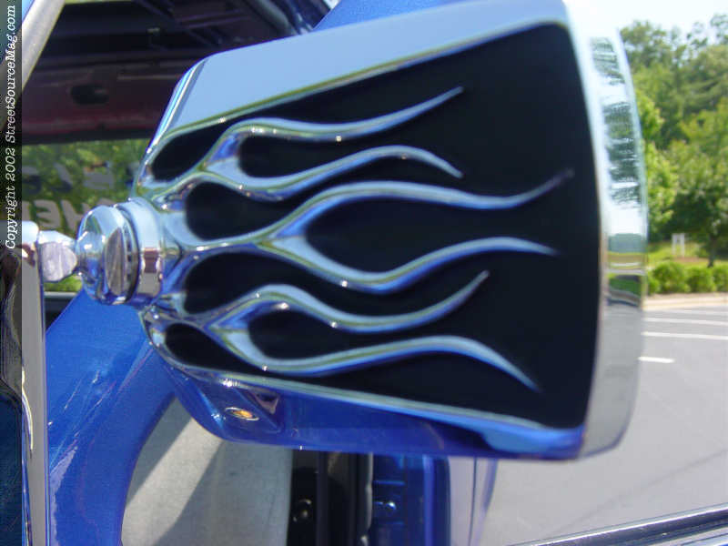 The only way to remove the bed if needed is to climb underneath to get to the bolts on the custom bed mounts. The gas door was also shaved and the filler neck was relocated to the top of the bed and put under a teardrop shaped pop up gas door. Once all the bodywork was done, it was time for Chad to spray the 2001 Civic SI blue paint with pearl on his Ford. When the paint was dry enough, Chad bolted on a pair of custom flamed billet mirrors.