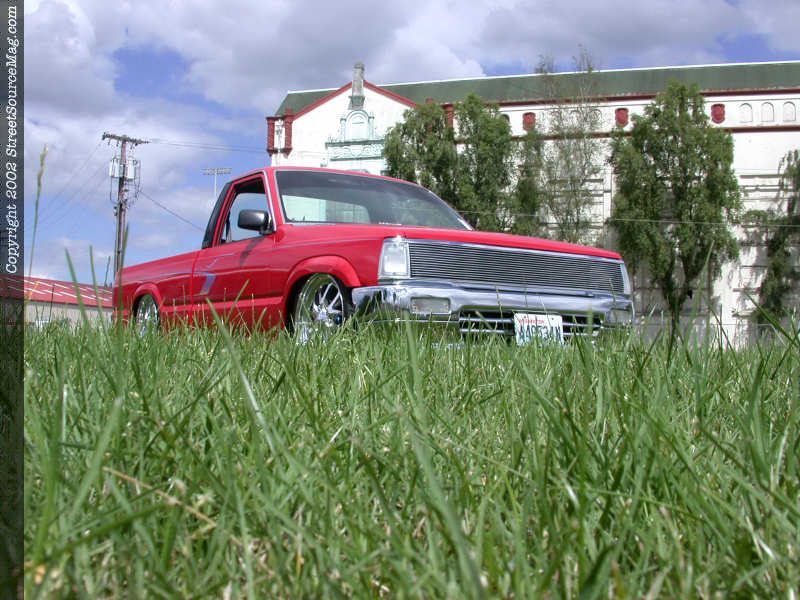 Loving the low stance like the first Minitruck he'd ever scene, Brian would first turn his attention to the suspension. First the frame would be notched 3 inches allowing the axle to move into the frame rails at lower levels along with the installation of a set of Chassis Tech ladder bars. The front would be removed of the torsion bars and a set of AIM lowering spindles would be installed to help bring the front level with the rear. This would set up things for Firestone 2500 lbs bag set up at each corner for adjustability.