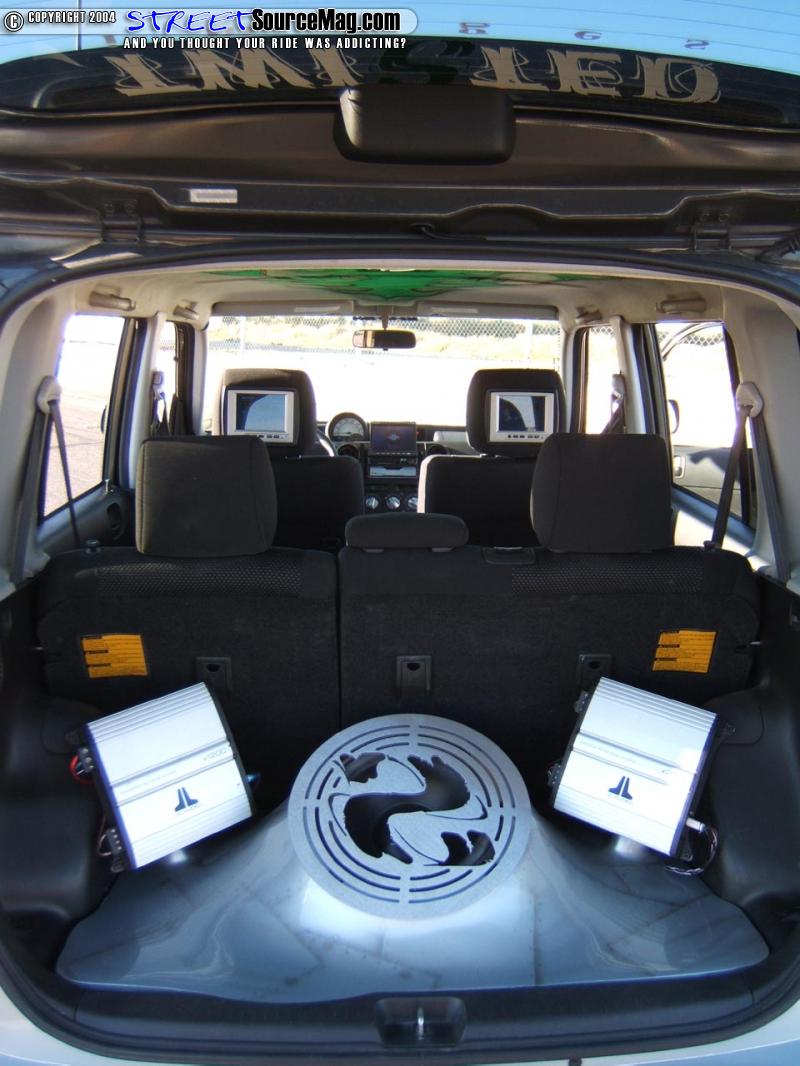 Looking inside the box, more paint is found about, like the airbrushed headliner, dash trim, and console trim which were all painted by your favorite painter, James Cashman. Fender Bender Intl. also whipped up a set of custom billet pedals, for a little bit of Scion love. Phil then added some accent lighting under the seats, dash, and speaker grills. The heart of Phil’s interior modifications is his killer mobile entertainment system, which starts off with a Alpine 6.5 in head unit with DVD player, which mans the two 5.6 headrest monitors. Crystal separates are mounted in the doors and in the dash for all those high notes. A JL 12w3 is mounted behind the rear seats in a custom fiberglass enclosure along with the JL amplifers, which power it.