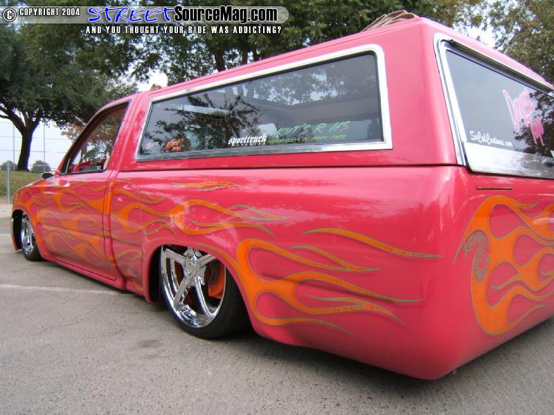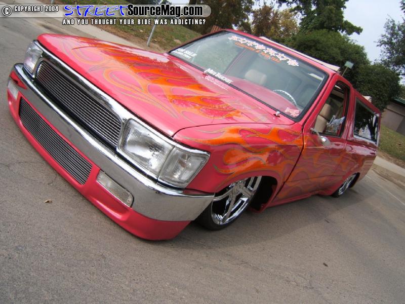 When Brent had completed the stance of the truck, it was then his duty to freshen up the exterior of the truck. He equipped it with a 4Runner front end consisting of grill, front bumper & valance, hood, and fenders. Then came out the welder, and Brent shaved the door handles, hood squirters, wiper cowl, mirrors, gas door, tailgate, and taillights.