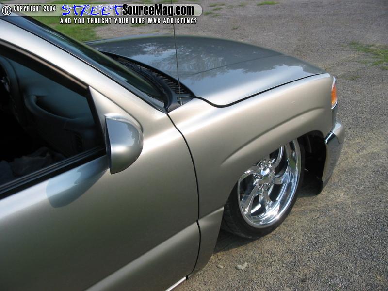 Next trailer fenders where be installed and the bed was rhino lined. Kustomwerks would also bring the bodywork to the next level including the welded in Sir Michaels steel role pan and tailgate handle flip, and shaved door handles. Joe Benne would lay down the Pewter paint. Some street scene mirrors where added. And a snug tonneu top would be installed to cover his bed from the elements. To keep his radio in tune a Billet Specialties antenna was threaded in.