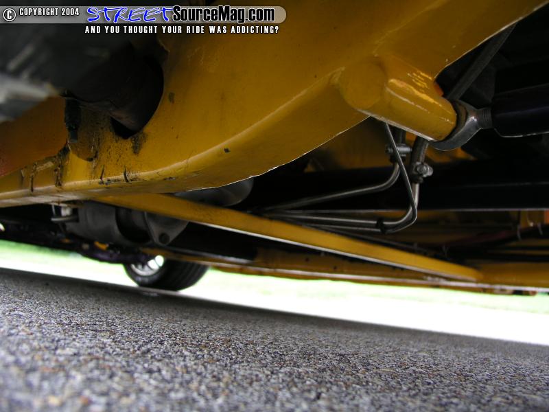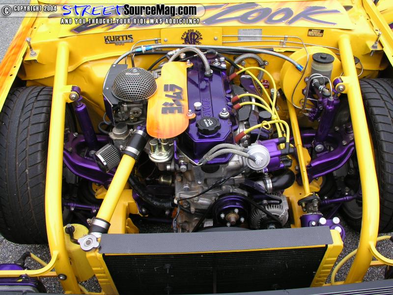 The engine cage extends throughout the firewall, and joins the frame. Notice the handmade brackets that replace the need for a core support. The front end was to look like a race ready spec truck. This truck was built when the first Nastrucks were appearing at exhibitions, they wanted the mini to look the same way. Notice the carbon fiber valance below the window.