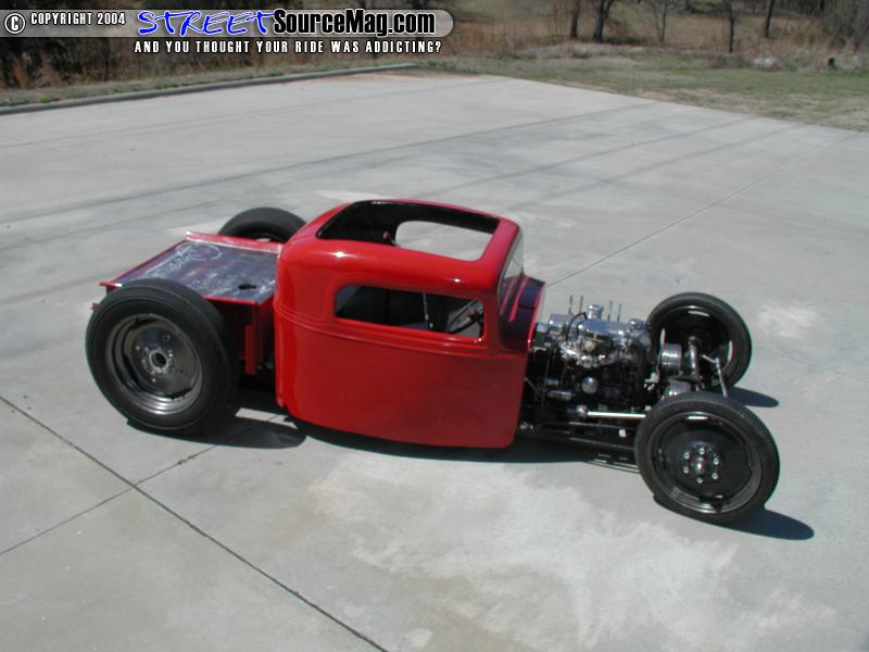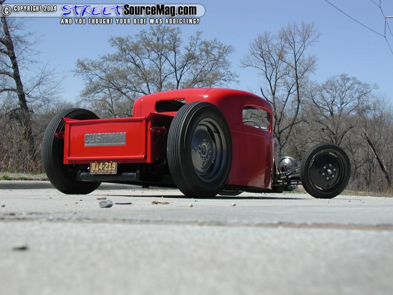 So as it came to a close and winter was slowly fading the guys headed to the paint booth for a few good coats of gloss black for the chassis and International Harvester Red for the body. Yes that is all straight enamel paint for that smooth finish that lies on there. Final assembly began and things that had become mock up went back on for the last time. The lights were off a model T aftermarket deal with aftermarket bubble lenses. The taillights are actually Dazey brand 1960’s ice crushers cut down. The steering was a Corvair box that Jeff built all of the linkage and so forth for to steer him in the right direction. As for a wheel to hold to while starring at that European EBAY dash he stole a wheel from one of his 1968 John Deere lawn mowers. The seats were built from wood and covered by a co-worker of Jeff’s.