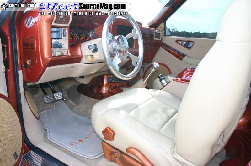 The interior of Bobby’s truck was all smoothed and glassed. The interior also features HOK painted parts with custom graphics. Bobby’s interior features everything from a custom stereo, chrome fire extinguishers, billet steering wheel, to custom wrapped seats.
