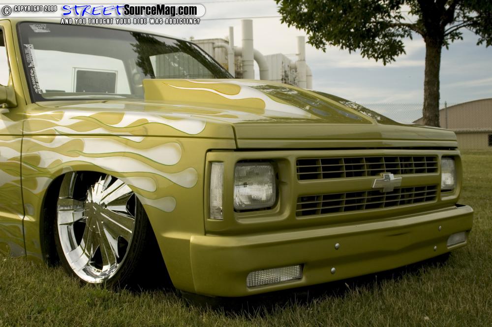 The S10 would be laid out on 20 inch wheels at all corners along with hosting 2500 lb Firestone air bags. With a 3 link in the rear and 2” spindles in the front Rusty would be laying his S10 flat on the ground.