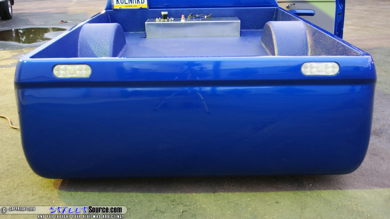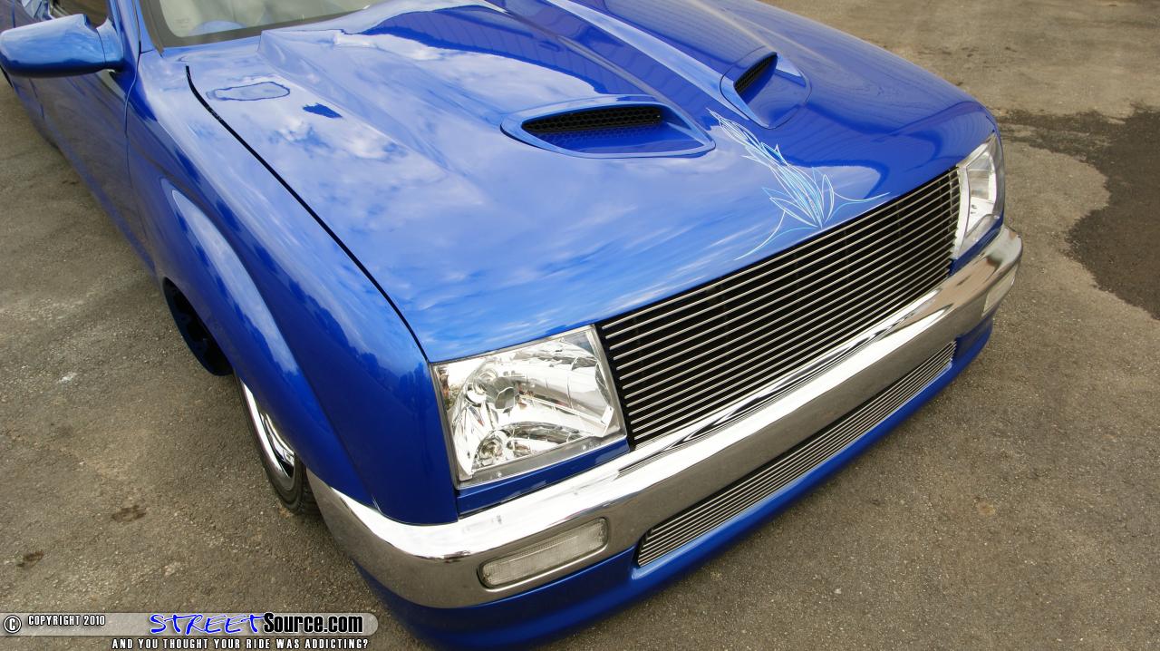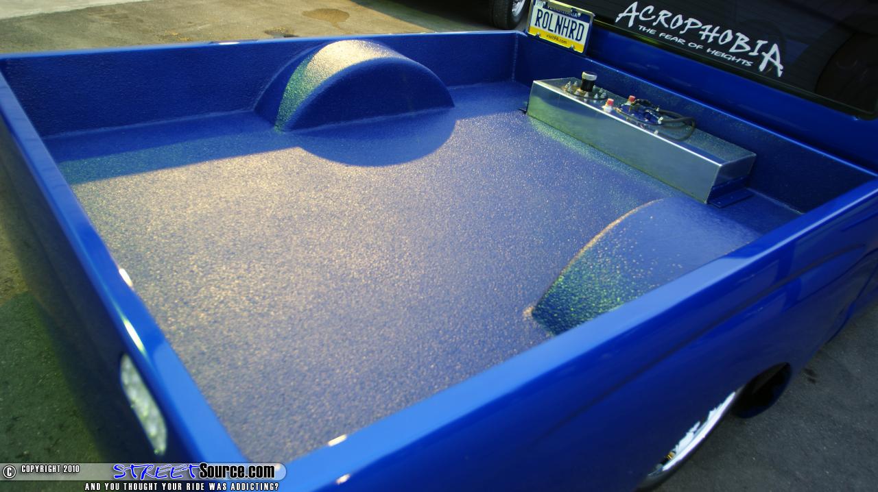 But before Carl could even enjoy his new toy, the new owner of his Chevy was already complaining that there his new ride was leaking air like a sieve, unable to hold air for more than two hours at a time. At that point, if you can’t fix a supposed air leak, probably created by you in the first place, perhaps it’s time to throw in the towel. “I drove that truck everywhere,” Carl says. “I could leave it up for over two weeks without ever having an issue and this guy gets it and suddenly it won’t last two hours.” Moving forward, Carl will be the first to admit that he pretty much bought the truck as it sits in these pictures today. Giving credit where credit is due, most of the work was completed by the original owner and his team of builders. Thomas Matzke, the original owner of the Tacoma, started by sending the truck over to Chase at Real Life Kustoms in Camilla, Georgia to start this truck off right with a solid foundation. Starting out up front, the front clip of the truck was Z’d while the rest of the frame was scrapped and replaced with new frame rails. DJM upper control arms and Slam Specialties Re-7’s are utilized up front while the rear received a 1992 Toyota Hilux rear axle and a two link. To plant this Taco to the pavement, 20x7.5 American Racing rims were wrapped in 225/30/20 Nexxen rubber. Real Life Kustoms also continued the build by handling the body mods and paint scheme as well. With the truck body dropped 3 ¼”, the truck was completely shaved of all its unnecessary extremities, such as the door handles, tailgate, taillights, and antenna. The bed was smoothed out and a GTO hood snorkel was grafted on to the factory Tacoma hood. A Grant Kustomz full skin combo found its way out back while Street Scene mirrors replaced the factory ones. Once the body of the truck was worked to perfection, Chase sprayed the truck with Mono Chromatic 2005 350z blue while Pinstriping Mikey added the pinstriping on the hood. With the exterior of the truck was pretty much wrapped up, the truck was turned over to Dale at Xzibit Upholstery in Tampa, Florida to start on the interior. 1996 Toyota Celica seats were wrapped in blue and grey leather while the carpet was also laid in light grey as well. Steve Colley was then tasked to fiberglass the dash, which was then painted to match the exterior of the truck. A Colorado Customs billet steering wheel and billet handles gave a nice accent to the interior while Cyberdyne digital gauges rounded out the dash modifications. Steve Colley was called upon once again to add the killer stereo system found behind the front seats. A custom fiberglass box was built to house the two 15” Audiobahn subwoofers and the Audiobahn amplifers. Audiobahn 6 ¼” and 1” tweeters can be found in the doors and dash of the truck as well. To maintain control of all of this audio gear, a Kenwood head unit was mounted in the dash along with a 7” viewing screen. Carl would like to thank Thomas and Chase for all of their hard work and creativity that went into the truck, along with anyone else who was involved with the original build. He would also like to thank all of his Acrophobia family for all of their support to keep wrenching on the truck. And of course, he would like to thank his daughter for making a great decision.