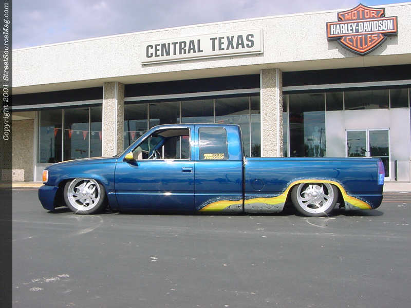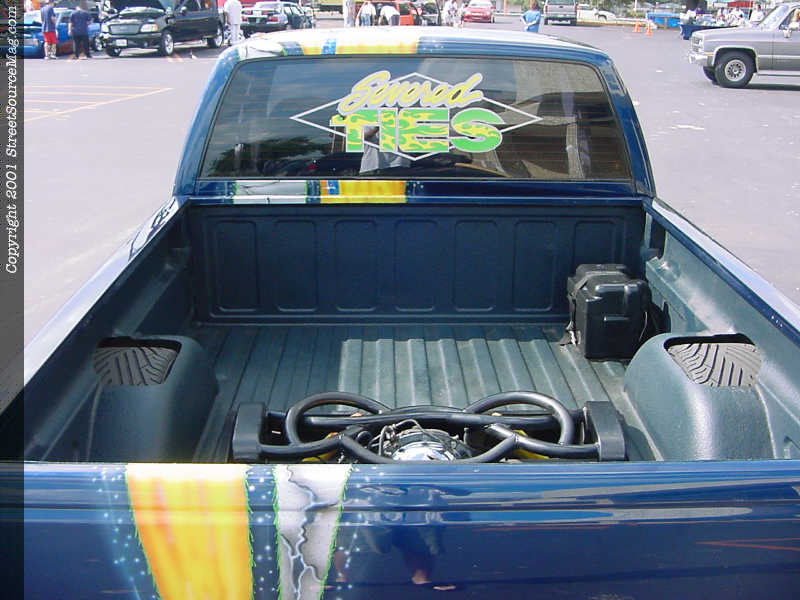 Now with his ride hugging mother earth and shaved out, it was time to hand over the rains to Clark Barker to apply his wealth of paint knowledge to this beast of a ride. To start things off, Clark would go over the truck making sure it was prepped to perfection and block one last time before adding the paint. After being satisfied with what he had to work with, it was time to add the PPG paint that Jim had requested. The base color that Clark would first apply was Indigo blue. After applying many coats, Clark then tested his hand at applying graphics to Jim's ride.  Once the final graphics were sprayed, the truck was cleared, cut and buffed. This gave Jim a warm fuzzy feeling inside.
