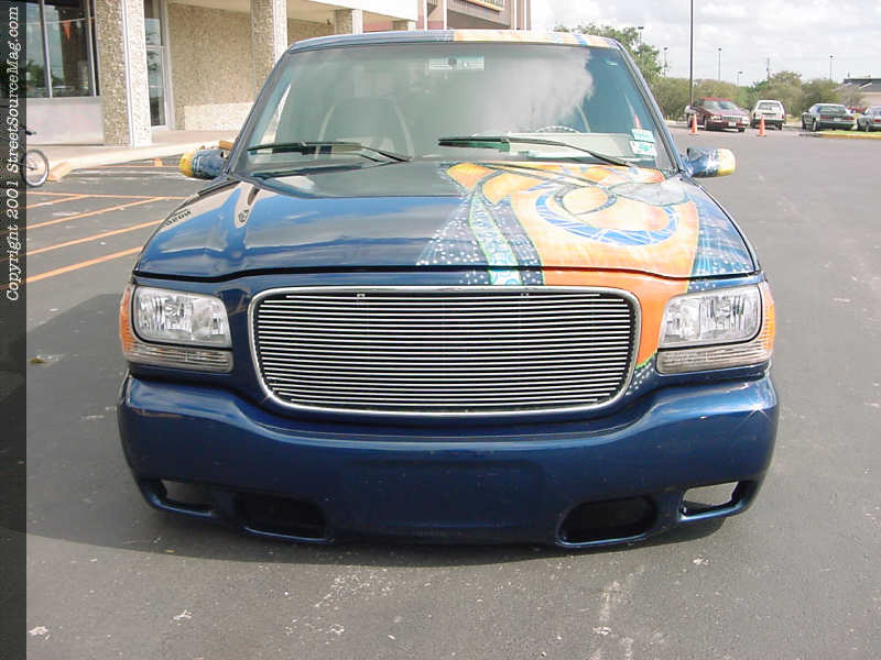 A new hood, fenders, headlights, front bumper as well as a Trenz billet grille insert were installed and aligned for a stock look. Next, Luis shaved a few items to give Jim's ride an even more custom look. For starters, Luis shaved the stake pockets on the bed of the with truck and removed the third brake light.  | Smoothing out the bad rails always gives a clean look. To add to that, Jim had the third brake light removed as well. |