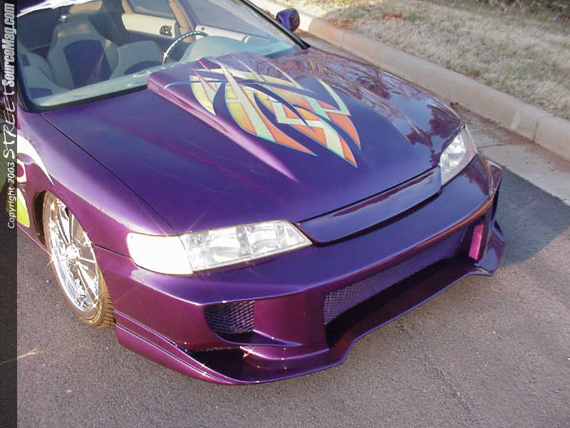 Embrey's was now ready to perform a few custom modifications that would set Michael's Accord apart from the rest. To do this, they first ditched the factory hood and replaced it with a custom cut and molded fullsize Chevy cowl induction hood.  The fenders were also custom fit using TransAm fenders, complete with the T/A vent. Embrey's also installed a Wings West Aggressor front bumper and Wings West lip kit in the rear. After replacing the factory headlights with H.I.D. units, Embrey's prepped the Accord and then moved it into the paint booth to work some exterior color magic.
