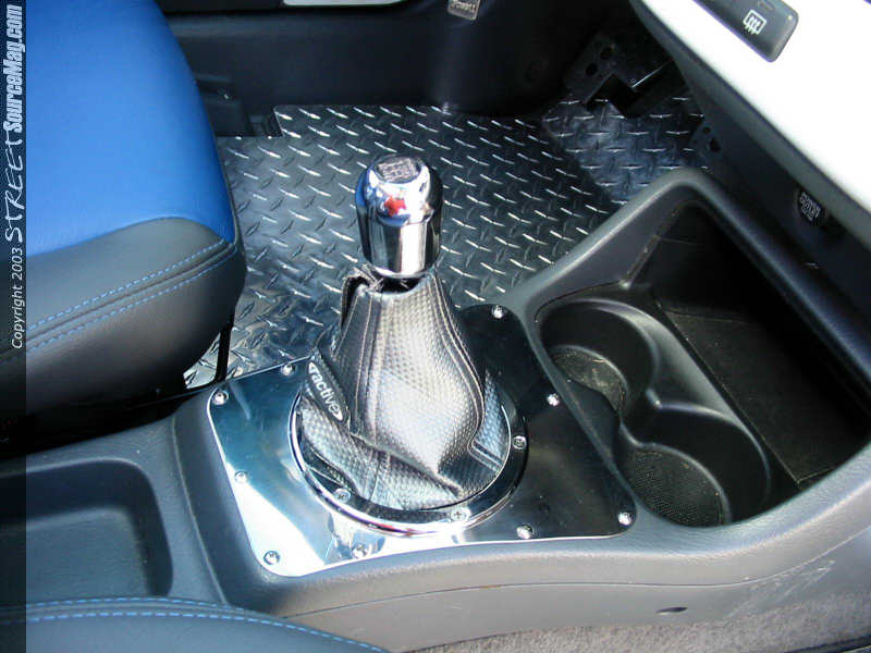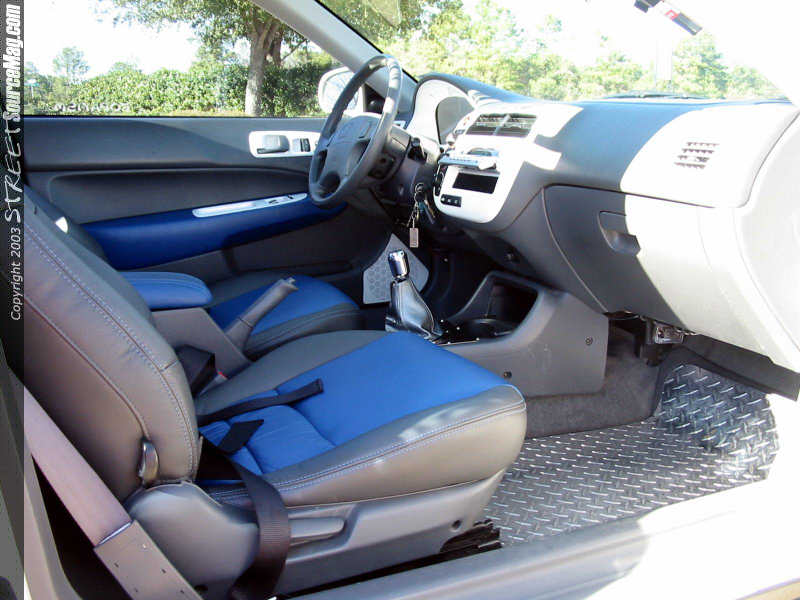 He then ordered up a touring view rear view mirror, toucan shifter cover, stainless shifter housing, Type R shift knob diamond plate floor mats, and street glow interior strobe lights.   After he installed all of his new parts, it was time to do something with the stock upholstery. Katskinz was called upon to help with this task.