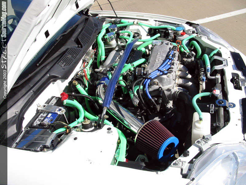 Corey' philosophy on racing an import is simple, "Its a show car not a race car, your not moving when your showing". Even though he doesn't believe in racing his Honda, he couldn't just leave the engine bay stock. He bolted up an OBX type r short ram chrome intake with a K&N air filter, chrome covers and brackets for misc engine compartment items, and lime green wire loom to hide the not so pretty factory wiring.  Next was a DC sports 4:2:1 1 piece ceramic coated header, attached to a 2 1/2" exhaust system, that also has a chrome finish.