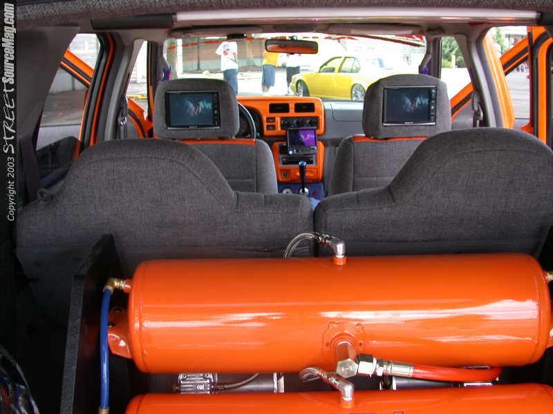 The front would be bagged with ½ inch port 2500lb bags while Rancho RS9000X shocks help stability all the way around. Finishing off the air would be 2 Viair Compressors, FBI air tanks, ½ inch orange hydraulic line with stainless steel fittings. Needing some extra room for the low, a custom cross member was installed and the Drive shaft needed to be shortened, which was done by Drivelines NW of Tacoma, WA.