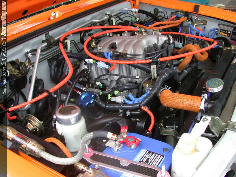 Nearly complete the engine was last on the long list of must do's. For starters a Stillen Intake, STR carbon fiber and polished dress up pieces along with orange and blue silicon hoses and wire covers would be installed. Next Nathan would install a 2-½ inch Gibson tri-flow cat witch dumps off before the rear axle, which had been custom bent. Finishing things off, the ignition system is computer chipped and the vehicle is traced by GPS for the alarm system, not a bad touch for this spendy completion.