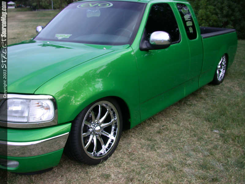 The next goal on the long list of modifications to complete would be bolting up a set of 20x8.5 inch Evo 5 wheels wrapped in 265/35 inch Dunlap's. With the wheels bolted up CJ would then need to notch the frame rails along with the wheel wheels to allow room when laying out the airride.  Toxic shocks are bolted up all the way around to help with the ride while SMC valves, 4 switches and ½-inch line bring about the air. A set of lower control arms helps to bring the front end down even with the rear.