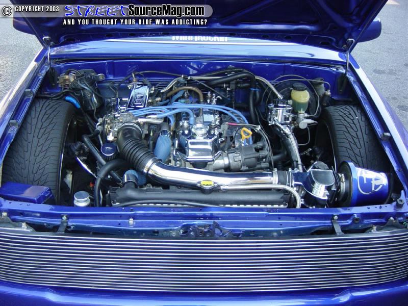 The motor for the Toyota is pretty much stock with the addition of a little chrome and paint here and there to make it match the rest of the truck. A custom 2.5" exhaust was made and a polished intake was added for a little extra power and sound.