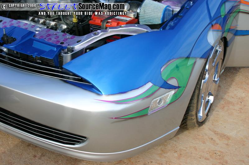 Keeping with the tossing of the old, and in with the new theme next to go would be the stock headlights, which where shaved completely off. A custom-made billet grille was fitted along with a VIS Cobra fiberglass hood to finish off the look of the front end. A gaping whole was cut in the roof to fit the 35x40” Street Beat Customs sliding rag top. Next the front and rear bumpers would be molded in to give the body of Stevie’s Focus a clean and seamless look, while still maintaining the clean look they where going for.