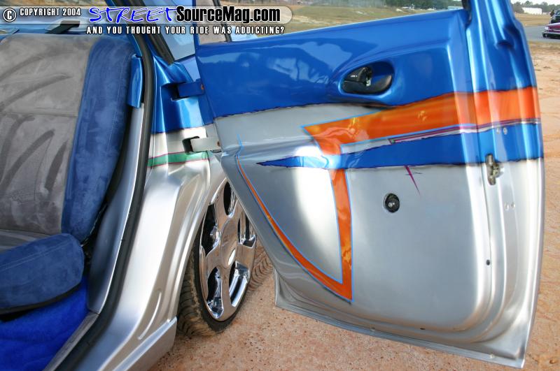 House of Colors orange, green, purple, baby blue, and green are the colors that make up the graphics. Inside the baby blue graphics are money symbols and orange skulls are painted in the jambs. A thick layer of clear would be applied next to give the paint the mirrored shine it needed.