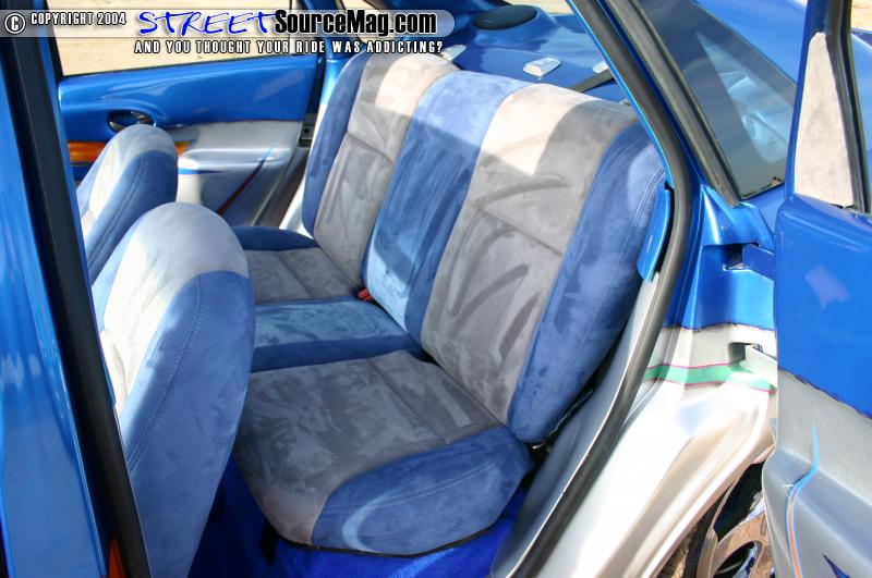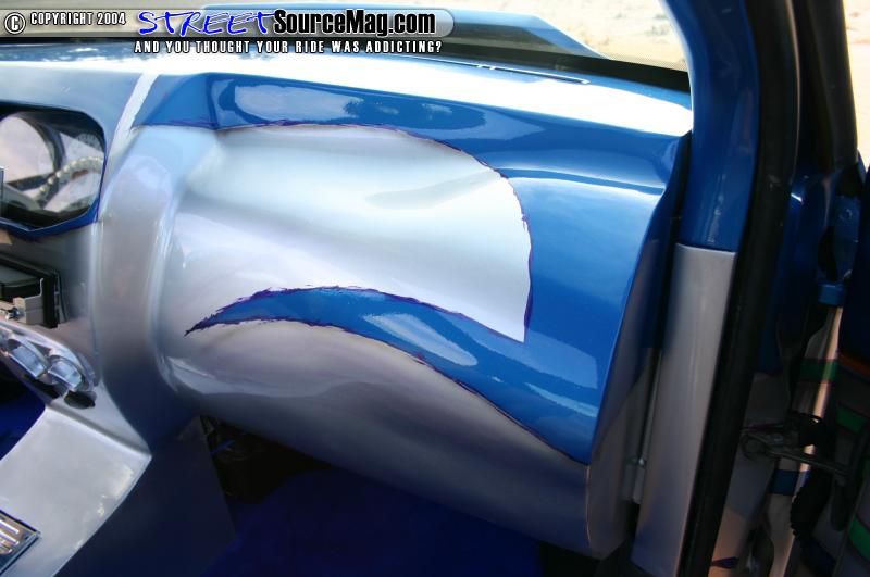 The seats and headliner are wrapped in Miami Suede with the seats being covered in blue and silver and the headliner being wrapped in blue. The suede was laid down by Gary’s Auto Trim in Georgia. The door panels and a panel on the trunk where glassed and then graphed out. Focus Central AC billet knobs set the dash off.