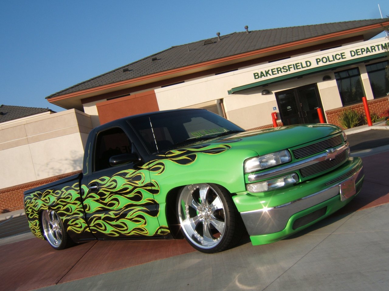 The first thing that draws your attention is the awesome tribal flame paint job that covers every inch of the exterior. All using House of Kolor paints, Kyle from world famous K-Daddyz Kustoms in Bakersfield, Ca., takes the honors for this marvelous piece of rolling machinery.   With pride, he leaves his signature on the tailgate of the truck which just completes the custom job.