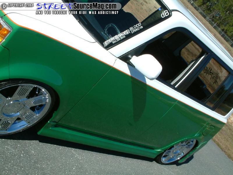 With the Scion ready to paint Mike would have the entire body in and out color changed into a two-tone paint scheme. The paint of choice would be a PPG base white and wrangler green. Breaking up the two-tone would be a custom orange pinstripe.Old Dixie Paint and Body out of Vero Beach, FL would be responsible for the bodywork and paint.
