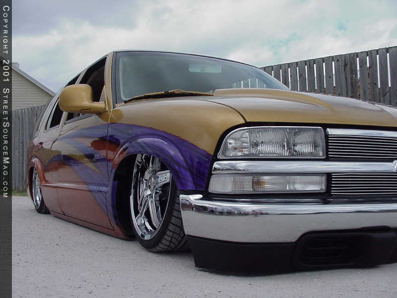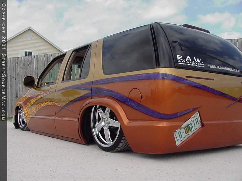 Next, Tom came up with a few ideas to set the exterior of his Blazer off from the rest. To get his ideas moving, Tom contacted Mad Mods in Hollywood, Florida. In their hands, Tom's Blazer was first shaved of all unnecessary items including the roof rack, door handles, antenna and taillights. Mad Mads then welded the rear of Tom's Blazer closed and installed High Tech LED's in the place of the taillights. In the rear of Tom's Blazer, Mad Mods also went to work installing the rear quarter panels from an S10 pickup truck.