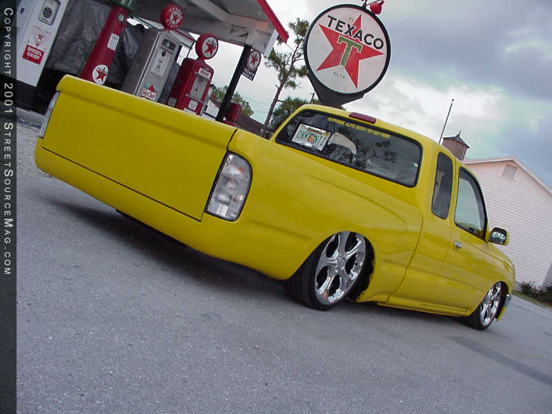 The owner and Express Auto Body again were responsible for the flames. Finally, to wrap out the exterior of Stephen's Taco, clear taillights were installed as well as a lexan rear window, complete with frenched license plate box. Stephen's Taco had started to take shape, but the owner knew he wanted it to lay terra firma. To accomplish this, he called the crew at Draggin Azz Customs in St. Petersburg, Florida to perform the necessary work to lay his Taco out. First, Draggin Azz performed a super step notch that would allow the rear of Stephen's Taco to fully lay out.