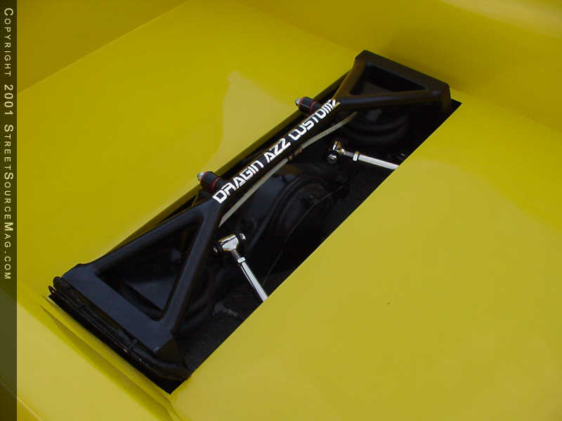 Then they bent custom tubing and created one-off mounts for the Firestone 2600lb airbags in the rear of Stephen's Taco. Next, the Draggin Azz crew ditched the rear leaf springs and replaced them with a chrome triangulated 4-link from TCI. In the front, a custom cross member was built and Firestone 2500lb airbags were installed. To smooth the Taco's adjustable ride out, Doestch Tech shocks were installed in the front and rear. Finally, to allow Stephen's Taco to go from railing status to driving-height status, electric fast valves were installed.