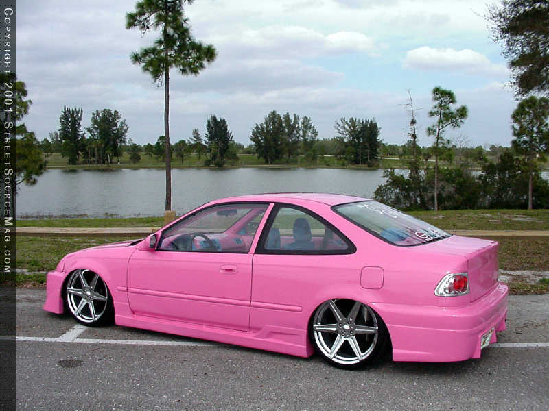 Starting in the dash, Slammin' installed a Pioneer 9000 headunit and then installed JL Audio 5.25's in the doors. A JL Audio 15-W3 sub resides in the rear and Crossfire 1000D and Crossfire 50.4 amps drive the entire system. Since Karen's Civic is more "show" than "go," only a few minor changed occurred under the hood, but were made specifically for winning shows. You'll find a highly detailed stock engine, complete with painted to match parts such as the valve cover and intake, which were both painted pink.
