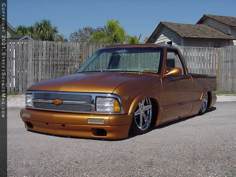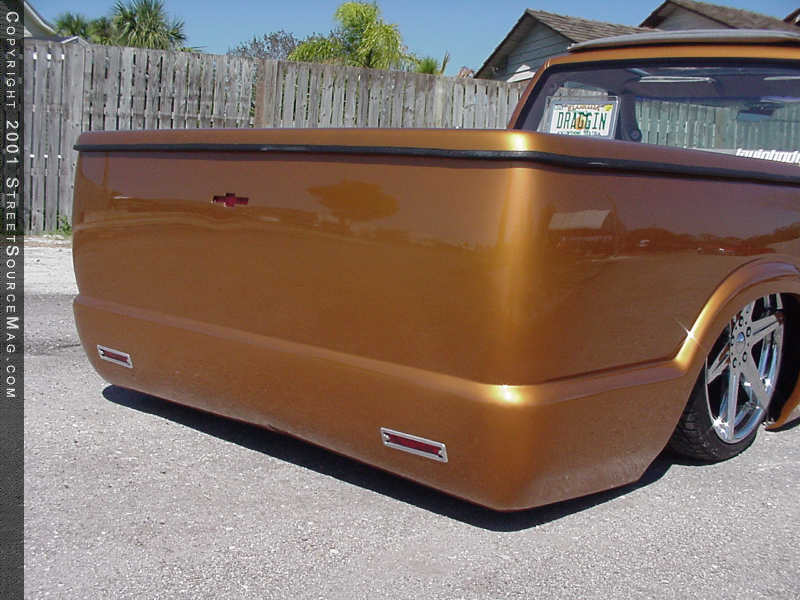 Up front, a grille shell from a '96 Blazer was installed complete with composite headlamps and a Trenz billet grille insert. The factory back glass was removed, tossed and a lexan unit, complete with license plate box, was installed in its place.  Next, a big hole was cut in the roof, allowing for the installation of a 40x24 Street Beat Sliding ragtop. Dennis also decided to ditch the factory mirrors and installed BMW M3 mirrors in their place. Finishing off things was a fiberglass bed cover. After Dennis' list of body mods was complete, he rolled the truck over to Harper's in Orlando, Florida where the entire truck was sprayed using '98 Volvo Saffron paint, then buffed to perfection.